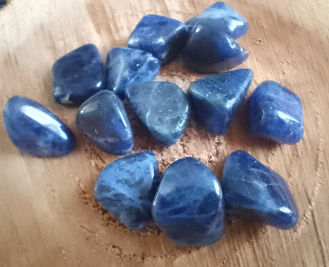 Pierre roulée Sodalite. Permet d'aller jusqu'au bout des choses en calmant les peurs. Contre l'inquiétude. Favorise la confiance en soi